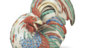 古九谷様式色絵のなかでは白地の多い文様構成でありますが、同様の作風のものにMOA美術館所蔵の「酒宴文大皿」(図53)があり、裏文様も 「酒宴文大皿」 と同様で、二方に飛鳥、二方に蓬萊山と花文様をあらわしていますが、古九谷様式のなかでも特に魅力的な裏文様であります。高台内に「福」字銘を書し、紺青を上絵付しています。