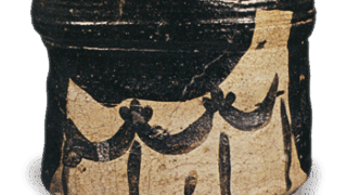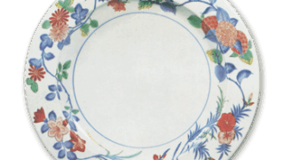 腰に段をつけた大皿で、口部は内に抱えています。見込中央に枝にとまった一羽の翡翠を描き、梅の枝と笹をあしらっています。内側縁文様は黒線描きの波涛文の上に黄釉をかけ、広い縁には牡丹の花と唐草を六か所に配して紺青釉で上絵付し、地は七宝文の上に緑を上絵付しています。見込に描かれました翡翠図は絵画的な風韻の高いもので、数多い古九谷様式色絵のなかでももっとも優れたものの一つにあげられます。裏面は三方に花を配した牡丹唐草を大まかにあらわし、濃い紺青の上絵具で賦彩しています。高台内中央に 「福」字銘らしきものが書されていますが、上にかかった紺青釉が厚いため、判読しがたい。