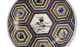色絵亀甲牡丹蝶文大鉢と同様の器形で、図柄は異なりますが同時期の作と思われます。見込円窓内に、土坡と太湖石に花と蕾をもつ牡丹の樹を描き、草花を添え、大小の蝶を三羽空間に点じていますが、この種の大皿としては細やかな文様であります。縁文様は黄色の枠どりをした色紙文様が八つ割に配され、それぞれに老樹に宿る鷹と、二か所には木菟を描いています。裏面は格狭間風の窓を五か所に配し、それぞれに山水図を描き、窓と窓の間には唐花文を配しています。高台内に篆書体の文字が二重圏内に書され、その上に緑釉をさしています。