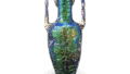 卵形の上下に口部と底をつけたような独特の器形の壺であります。このような器形の壺が三点現存しています。形から胴にかけて、あたかも垂幕のように不規則に緑釉をかけ、そこに丸文と大小の花文様を散らし、丸文内には四方襷、七宝文などを赤であらわし、黄彩で枠どりした花文様の内には紫で菊花文を埋めています。胴には家屋や塔などを配した山水文様を連続的に描いていますが、白壁の家屋の表現は古九谷様式の色絵特有のものであります。明時代末期の楼閣山水図によったものでしょうが、和様化されて筆致は狩野派風であります。頸部と底部には紺青釉と緑釉を帯状にめぐらして、締りをつけています。