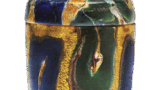 コアガラス脚杯 ガラス 2023.05.21 エジプト前14世紀MIHO MUSEUMコアガラス古代メソポタミアやエジプトで発達した、世界最古のガラス容器の制作技法。金属棒に耐火粘土や獣糞などを被かぶせて芯(コア)をつくり、そのまわりを本体となる色ガラスを熱しながら巻きとり、その上に別の色ガラスを巻き付けて、冷却後に棒を引き抜いて内側の芯を掻かき出して成形する。