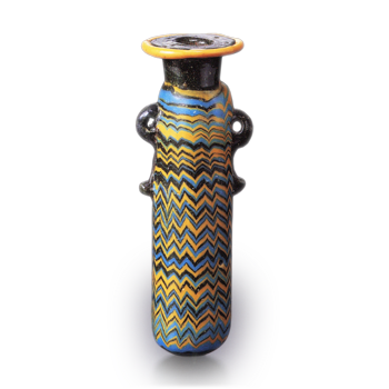 コアガラス両耳付瓶 ガラス X Facebook はてブ LINE Pinterest コピー 2023.05.22 東地中海地域前5世紀MIHO MUSEUMコアガラス古代メソポタミアやエジプトで発達した、世界最古のガラス容器の制作技法。金属棒に耐火粘土や獣糞などを被かぶせて芯(コア)をつくり、そのまわりを本体となる色ガラスを熱しながら巻きとり、その上に別の色ガラスを巻き付けて、冷却後に棒を引き抜いて内側の芯を掻かき出して成形する。
