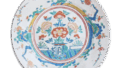 東京国立博物館に一対で所蔵されていますもので、古九谷様式瓢形徳利中の白眉と称されています。明らかに祥瑞の捻花文徳利を倣ったもので、しっかりと引き締まった瓢形の胴に捻花風の浮文をめぐらし、四方の白地に草花文を描き、他の四方には口部から裾にかけて、赤で籠目文、四方襷文などをあらわしています。高台は平底でありますが、この種の徳利のなかには蛇目高台にしたものもあります。