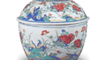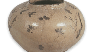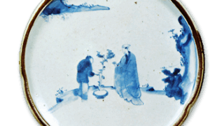 これも他に例を見ない構図であります。松の老樹に二羽の鳥が宿り、幹には蔦をまとわせています。まことにおもしろいのは樹間に鳥の巣をあらわし、中に雛を描いていますことで、このような特殊な画題が何故に考案されたものかまことに興味深い。裏面には側面に松葉散文をあらわし、高台内の角内に「福」字銘を書し、緑の上絵具をかけています。