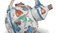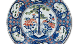 濃い紫の絵具をたっぷりと使って大輪の牡丹を描いた構図は、古九谷様式を象徴する絵文様として声価が高い。この種の牡丹図をあらわした大皿は五点ほど現存していますが、うち三点は内側に幾何学的な文様をあらわし、この皿と次図のものは見込いっぱいに牡丹と蝶の文様をあらわしています。円形の平らな皿で、縁をほとんど立ち上がらせず、古九谷様式の大皿のなかでも珍しい器形のものであります。