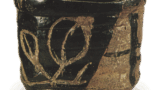 縁に鉄釉をまわして縁紅とし、見込いっぱいに牡丹と木賊の図をあらわし、木賊と黄色の蝶の髭にのみ赤を点じています。外側には独特の牡丹唐草が染付であらわされ、高台内にも染付で角福銘が書されています。
