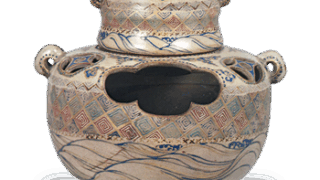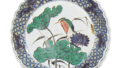これらも口部や肩には染付で連続文をあらわし、胴には太湖石を中心にした菊花文を枝先をのばしてめぐらしています。純然とした乳白手素地とはちがった柿右衛門様式であり、図52の頸まわりの染付の蓮弁文や図53の鋸歯文などがかなり荒々しい筆体で、一般に見ます伊万里染付と似たものであります。しかし上絵具の色調は一般に見ます伊万里とは異なり、赤 青 緑ともに明るく華やかな階調であります。