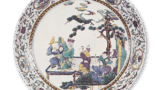 完成期の乳白手柿右衛門様式の代表的な作例であります。腰の張った鉢に、豊かな甲盛りの蓋が覆うようにかぶさり、蓋甲中央に装飾的な鈕がつけられています。蓋甲と身の外側に波濤の浮文が素地にあらわされていて、それは型抜きのようでありますが、フリーハンドで彫りつけたかと思わせるほどのびのびとしていて、しかも自由な動きがあります。この種の波濤浮文をもつ蓋物は他にいくつか見ていますが、なかではこの鉢はことに彫文様が優れ、素地もいったいに薄手でしかも勁さが感じられ、彫の深い部分は透明釉が厚くかかってわずかに青味をおびています。上絵はその波上に菊花と葉と千鳥を散らし描きしていますが、美しいです白磁を効果的に生かす配慮がうかがわれる。素地が上質ですために、上絵の赤、青、薄緑のいずれも発色が鮮やかであります。身の見込中央に飛鳳と珠を団文風に色絵であらわして、蓋裏にも色絵で折枝文を描いています。やや高い高台内ほぼ中央に、小さな目跡が一つ残っています。さらに、高台内に薄い青の上絵で、「ウ」といいます文字が小さく書かれていますが、おそらく注文先の目印でしょう。