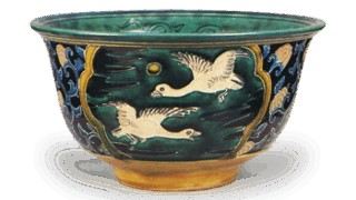 前図と似た作行きでありますが、五弁の輪花の中央を浅く切り込んで変化をつけ、見込の中央に小さな花文を配するのは、前図にはなかった文様構成であり、その後柿右衛門様式の鉢の常套手段になっていく。また内側に描かれました梅、牡丹、柘榴、外側の牡丹と葡萄棚の色絵もいささか筆致がかたくなっています。しかし完成期の代表作の一つであります。
