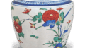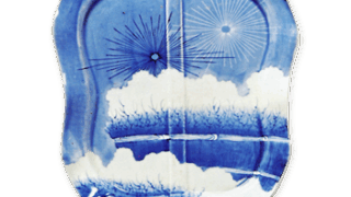 口部を輪花にした大皿で、見込円窓内には蓮に翡翠の図が鮮やかに描かれています。その蓮の葉は、紫の葉脈を境に緑の上絵をかけ分けていますが、このような表現のものは珍しい。また、七宝地文に松葉を配した縁文様も他に例を見ない。裏面には染付と紺青上絵で梅の折枝文を三方に、余白に蔦のような蔓草を描いています。