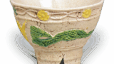 見込八稜形の枠内に、樹木と双鳥をあらわし、縁は俗に百花手と呼ばれています独特の表現で、菊花を主題にした秋草の叢を細密な描写であらわし、見込には紅葉した楓が描かれていて、見込、側面ともに秋景を描いたものであります。この種の百花の縁文様はいずれも見込に関連させた文様が描かれていますのが特色であります。裏面には六方に花を配した牡丹唐草が黒線描きされ、紫、紺青、緑の上絵で彩色しています。高台内には、明確に判読できないが、二重圏の角福銘を黒で書し緑彩しています。