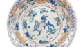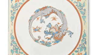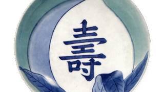 側面をまるく立ち上がらせた普通の器形の大皿であります。見込円窓内に椿に一羽の鳥が宿り、一羽は身をひるがえして飛翔する図が描かれています。まわりにあらわされた文様は、四方に菊花文を配し、間に雲気文を窓枠の内に描き、これも白地を多く残した構図でありますが、他に例を見ない珍しい図柄であります。