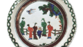 上質の磁胎で、低く立ち上がった縁をくっきりと縁紅にし、見込の円窓部は一段低くなっています。その内に山茶花に一羽の小禽を宿らせ、まわりには染付の祥瑞丸文を十五個めぐらし、二つずつ上絵付しています。類例のない器形の台鉢であり、染付、上絵ともに美しく焼き上がっています。