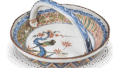 古九谷様式色絵には、手鉢は四、五点しか残っていない。あるいは特注品としてあまり作られなかったのでしょうか。底を平らに、口部を内に抱え込ませた銅鑼形の平鉢で、弓形の手を中央に差し渡していますが、把手の背には染付で唐草文をあらわすのが通例であります。