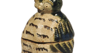 おそらく御所市域の古墳から出土したものでしょう。脚と杯部の接合部分に段を設けた大形の高杯の上に、九個の盤をつくりつけた子持高杯です。多数の杯を高杯に載せた子持高杯は須恵器には普遍的にみられますが、土師器のそれは非常に珍しいです。杯部の周囲に七個、内部に二個の器を置いたその配置も須恵器のそれに似ており、須恵器の子持高杯を模したことは明らかです。古墳への副葬品としてつくられたものでしょう。