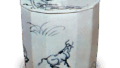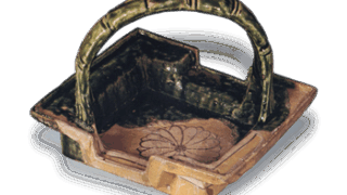 有蓋壺の肩に粘土紐をめぐらし、その上に一人の人物と四匹の鹿を等間隔に配した装飾壺の一種で、蓋の鈕の上に頭を高々とかかげ、口を開いた鹿が鈕飾としてとりつけられています。鹿はいずれも同一方向に向いておなじ姿態をとっています。頭をあげ、口を開いているさまは群がる鹿の鳴く姿を表現したものでしょう。両手を前に出した人物がなにを表しているかは不明です。鹿は、犬・馬などとともに装飾須恵器の題材として好んで用いられる動物の一つですが、このように鹿ばかりを五匹並べたものは珍しいです。器物はやや砂質に富んだ土を用い、焼成はさほど堅くなく、やや褐色を帯びた灰色を呈しています。