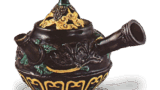 肩に先の尖った鍵形の耳が三個ついています。やや砂質の耐火度の高い土で、薄手の精巧な轆轤仕上げをみせています。焼成はさほど堅くなく、肩にかすかに自然釉がかかっていますが、十分熔けるまでにいたっていません。このような三耳を有する小壺はきわめて珍しく、あまり類例をききません。しかし壺瓶の耳に特色をもつ北陸地方の古い耳付壺の一つとして注目すべき作品です。8世紀後半代の作。
