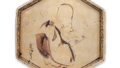 長胴平底の甕の外面に人面を描いたもので、墨はうすれ、顔かたちが辛うじて判別できる程度です。頭巾をかぶったような頭部で、鼻・口を枠で囲んでおり、ひげはありません。この人面墨書土師器は現在知られている最北端の出土例です。