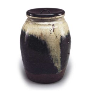 叩きづくりによる成形。 寸胴型で、頸の部分の数本の轆轤目によって形が引き締まってみえます。肩より下に厚く薬灰釉をかけ、内側と口縁部に黒飴釉をかけています。 表面に大小二本、裏面に一本薬灰釉をかけて文様をつくり、飴釉が薬灰釉の中に流れ込んで美しい景色をつくっています。腰から高台全体にかけて泥釉を刷毛で塗っています。 内側は燃料の松灰によって、美しく窯変しています。