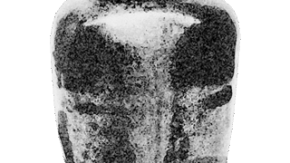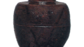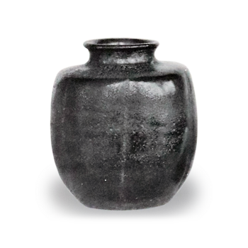 総体に黒ずんだ柿金気色で、口のあたりから共釉の一なだれがあるようで、胴に沈筋一本、腰以下は高く土をみせ、こまかい琥櫨目があるようで、円座で底は輪糸切。