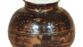置方に三本の黒釉のなだれがあ位、それぞれ長短があるようで、その垂下の状態を異にし、いずれも地の薄柿色と薄紫色が混合したようなところから粒状の黒色のぼかしに始まり、次第に濃くなり、釉留まりに至る線はゆるやかな曲線を保ちながら横にたなびいています。