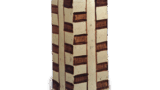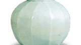 腰の張りを失って深い碗形をした身に低い台脚のついたもので、7世紀中ごろに近い作です。台脚は退化形式で、三方に長方形の透かしがあります。焼き上がりはきわめてよく、黒色の器肌の半面に濃緑色の自然釉がかかって見事なできばえをみせています。