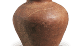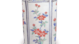 Ninsei: tea jar with design of a pavilion with figures and a carpascending a waterfall, enamelled wereHeight 41.6cm