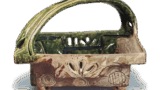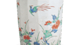 大きく口の開いた砂金袋形水指である。口まわりに細やかな刻みをめぐらし、口まわり一部と内面に白釉をかけている。また獅子鈕の蓋が添っているが、蓋には全面に白釉をかけ、金と銀で鈕を中心に七宝文様をあらわし、蓋裏は無釉である。底には仁清の大印が捺されている。この手の焼締膚のものも仁清は好んで焼いているが、なかではもっとも作行きの優れたものである。