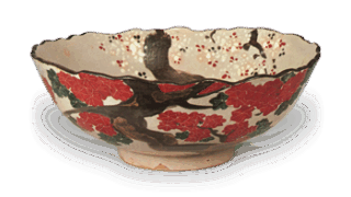 円形の平らな香合で、これにも乾山独特の白化粧を使った絵文様が描かれています。すなわち蓋の甲には素地の上に白泥と銹絵で茄子の絵を描き、透明釉をかけ、側面には檜垣風の文様を鉄絵であらわし、さらに見込みと蓋裏には八橋と菊の文様を白化粧地に呉須の下絵、金の上絵付であらわしたものです。底に 「乾山」 の銘を書し、花押を書しています。内箱の蓋裏には 「中井主水正ヨリ来ル 宝永二年乙酉三月日」 とあり、宝永二年といえばまだ乾山が鳴滝にいた時代ですから、これまた鳴滝時代の作であると推測されます。