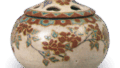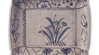 口を端反りにした深い鉢で、縁を文様に応じて切り込み、口辺にも文様に応じて透文様をつけています。内外に山吹と流水の文様を白化粧地の上に銹絵線描で描き、黄色と緑で上絵付しています。高台内には 「乾山」 の銘を長方枠内に書しています。古くから数奇者の間では乾山の色絵物の代表作とされています。