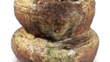 櫛目波状文で飾られた大形の広口壺は高杯形器台に載せられるのが通例ですが、まれには本器のような台脚のあるものがつくられています。大きくラッパ状に開いた口頸部は6世紀前半の作であることを示し、この古墳出土の他の器物の年代と矛盾しません。台脚は低いですが、三角形の透かしと段をもった古い形態のものです。