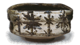 三足壺には扁平な蓋をともなったものと、本器のような深い蓋のものと二種類あります。身のつくりは両者とも同様です。蓋は台座をもった円形鈕のある釣鐘状の形態で、共蓋で焼かれています。身は肩に一条の沈線を施すのみですが、削りの三足は内反りになってやや力強さに欠けています。焼成良好で黄白色の自然釉が身蓋ともにかかっています。