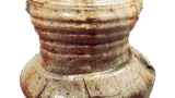 Sue ware: tripod jar. Excavated from Takasaki No. 2 Tumulus, Fukuoka-shi, Fukuoka. 6th century. Height: cover 9.3cm., jar 18.9cm.Kyūshū History Museum.