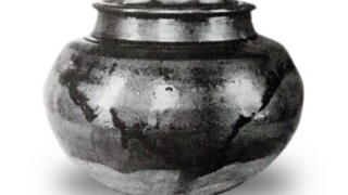 春慶柿 しゅんけいかき 大正名器鑑 2013.01.022021.11.07 名物。古瀬戸春慶茶入。初代藤四郎作の柿形茶入であります。 口縁は丸くやや開き、甑下が張り、肩がキッカリと衝き、胴が張り、胴の下方に沈筋一線が廻り、裾以下は朱泥色の土を見せ、細かい轆轤目が廻り、底は渦糸切。総体に栗色で、肩廻りにやや黒ずんだ共釉が掛り、胴紐にかけて土際まで二ヶ所釉なだれがある。口縁から甑際に達する疵繕いがある。小堀宗慶所持、益田家蔵。(『大正名器鑑』『茶道名物考』)