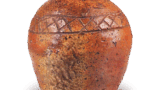 須恵器壺 「芒消壺」 古代須恵器壺 「芒消壺」 2023.11.042026.01.22 須恵器壺 「芒消壺」 Sue ware: jar mentioned as “Jar for Bōshō Medicine”. 8th century. Height: cover 3.7cm., jar 21.4cm.8世紀(蓋)高さ3.7cm 径18.6cm、(壺)高さ21.4cm 胴径29.8cm正倉院 薬壺類の一つで、芒消すなわち 「瀉利塩」 がなかに容れられています。扁平な宝珠鈕のついた共蓋の短頸壺で、焼成きわめて良く、自然釉が流下しています。陶邑窯の製品です。