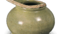 昭和三十五年、発掘によって出土したもので、一辺80cmばかりの、小児頭大の石を方形にならべた区画のなかから、花瓶三、九、皿六の十八点の緑釉陶器が出ています。いずれも鉄分の多い軟陶質の素地に濃緑釉を施したもので、花瓶の大中二本は釉の剝離が著しいです。