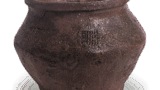 この水指は下部よりも口部に上がるにしたがって轆轤をせばめ、胴張りは力強く、口縁の帯広く、底周辺に目をめぐらし、表には竹垣を、半面には松を描いています。