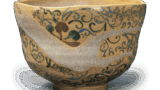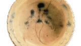 元来は平向き付としてつくられたものですが、相当古くから平茶碗として大事にされたらしく、汚れがありません。胎土はやや鉄分のある土で、高台は小さくて低いです。見込みに草花文を、口縁部に草と露を鉄砂で描いています。高台ぎわまで厚く長石釉がかかり、一、二五〇度前後の酸化焼成により、釉は渋い柿色に発色しています。