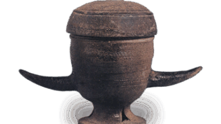 Ash glaze pottery: tall-neck jar. Excavated from a ceramic Kiln at Nisshin-machi, Aichi. 9th century. Height 23.3cm.