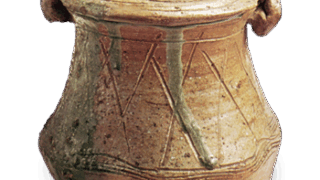 Ash glaze pottery: jar with four legs. Excavated at Otowayama, kyoto-shi, Kyoto. 10th century. Height 16.7cm. Seisui-ji.