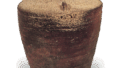 猿投窯產灰釉双耳瓶の数少ない完器の一つです。灰釉は底に近い一部をのぞいて全面に施されていたと考えられますが、いま完全に剥落してしまっています。この双耳瓶は胴部下半にもう一箇の耳をもっていますが、このような三耳をもつ形態は他地域の須恵器でもその初期の形態にみられるところであり、8世紀末のものです。