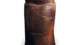 唾壺は中国では古く楽浪郡の漢墓から金銅製や漆製のものが出ていますが、陶製のものは唐末の越州窯にあり、それがわが国に影響を与えたものでしょう。正倉院には治安元年(1021) に施入された紺色ガラスの唾壺があります。本器は灰釉陶の末期に近い作で、上杯部の内外両面に、周縁からなかほどまで刷毛塗りによる灰釉を施しています。