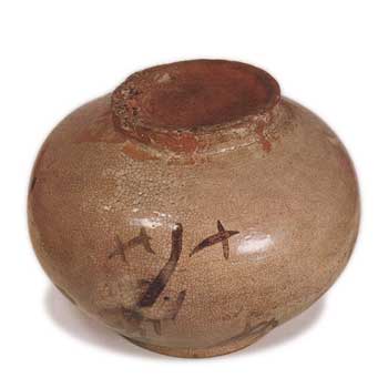 唐津ならではといえるような素朴な作振りの壺である。胴は、裾張り気味に豊かに張り、低い口作りは、内に段をつけて端反り気味に、高台は、内部をまるく無造作に削り出している。胴には李朝の鉄絵に似た樹木のような文様がとぼとぼと四株描かれ、内外全面に灰を含んだ長石釉がかかっているが、一方は荒く貫入があらわれて白みがちに、他方は赤く焼き上がっている。鉄絵も赤銹色に発色している。高台畳付の一部に小砂が付着しているが、おそらく甕屋の谷窯が作であろう。