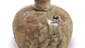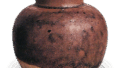先の片口小瓶の系譜をひくものでしょう。鎌倉末ごろから灰釉・鉄釉を施した片口小壺はしだいに数を増しますが、室町時代に入るとが扁平となり、まれに把手のあるものもつくられています。