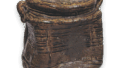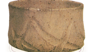 鉄分の多いねっとりした土で、叩きづくり。 内側にかすかに青海波文があります。口は矢筈づくりで、大きな耳が縦につき、底に小さな足が三個ついています。胴一面に筋文様を陰刻しています。全体に黒飴釉をかけ、正面に鉄砂をかけて景色としています。底面に逆L字のローマ字が陽刻文でついています。共蓋は鍵のあるL字が陰刻してあります。甕屋の谷、焼山両窯からL字のいろいろな銘入の作品が出土します。