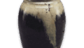 叩きづくりによる成形。 寸胴型で、頸の部分の数本の轆轤目によって形が引き締まってみえます。肩より下に厚く薬灰釉をかけ、内側と口縁部に黒飴釉をかけています。 表面に大小二本、裏面に一本薬灰釉をかけて文様をつくり、飴釉が薬灰釉の中に流れ込んで美しい景色をつくっています。腰から高台全体にかけて泥釉を刷毛で塗っています。 内側は燃料の松灰によって、美しく窯変しています。