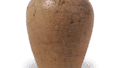 古瀬戸初期麻子の二類型のうちの直型のもので、やはり蔵骨器として用いられていたものです。肩の張りがつよく、底部に向けして直線的につくられた長い形はその祖型となった中国陶磁にきわめて近いものをもっており、最古の型式に入るものです。紐土巻き上げ成形で、器面は削り調整をしています。灰釉は単味で層が薄く、刷毛塗りによる釉むらが著しいです。
