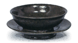 内田皿屋窯の作で、 数多い絵唐津向付のなかでももっとも瀟洒なものでしょう。 これもまたやや大振りですので、 火入に用いられています。 胴裾はまるく、口から胴にかけて四方にして、 ロ縁に鉄絵具をめぐらし、一方に放射状の線条文、 一方に串団子と志野などにも見られた矢先文を描いています。 鼠地に鉄絵文様がくっきりとあらわされて鮮やかです。