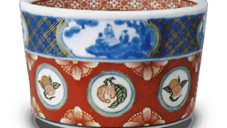 が丸く、底部に向かって細くなった胸形は鎌倉末の古瀬戸最盛期の形態です。文様は胴全面に印花文を埋めています。主文は下半にらした大個の丸文で、なかに九個の梅花文を入れています。その上部に円と丸剣先文を、さらに上部に唐草文と花弁文を誇らしています。
