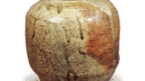 口頭部がわずかに外反し、肩の張りのつよい形をしており、ここの種の広口のうちでは、覚園寺の心壺とともに、最も古い位置を占めるものです。文様は胴の中央部に描きによる細い線で丹唐草文を描いています。上下に大きな空白部分をつくっていることも古い文法を示しています。鉄釉は赤味を帯びた茶褐色に黒稿の多い飴釉で、肩の部分はかせて黄褐色に変化しています。